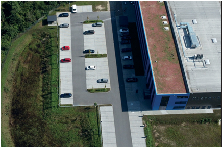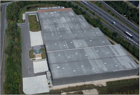 August 2021, drone view of the facility during working hours. No truck docked, few cars on the parking lot.