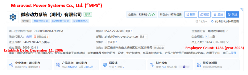 According to Qichacha, MPS’ Chinese name is 微宏动力系统(湖州)有限公司. What’s worth noting is that MPS also owns 100% of 3 out of 4 subsidiaries located in China and accounts for almost the entire employee count in China. This makes MPS the key Chinese and global subsidiary of MVST, as they also operate all the battery cell manufacturing capacity of the company.