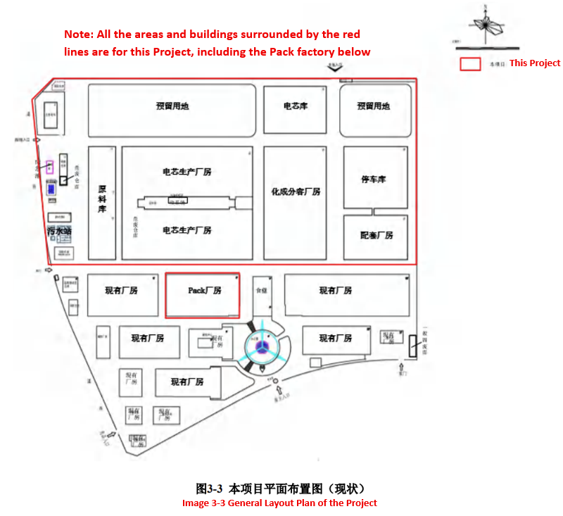 In April 2024, ZhongYi Testing issued an environmental projection inspection report for MVST’s “Annual 11 GWh Lithium-Ion Battery and System Project.” The report delineates three campus areas: Area 1 (new 11 GWh expansion), and Areas 2 and 3 (existing operational plants). The accompanying site maps highlight Area 1’s footprint, which spans roughly the same, or slightly larger, surface area as Areas 2 and 3 combined. A detailed layout shows Area 1 housing a new cell production facility, an additional pack facility, and other related support facilities.