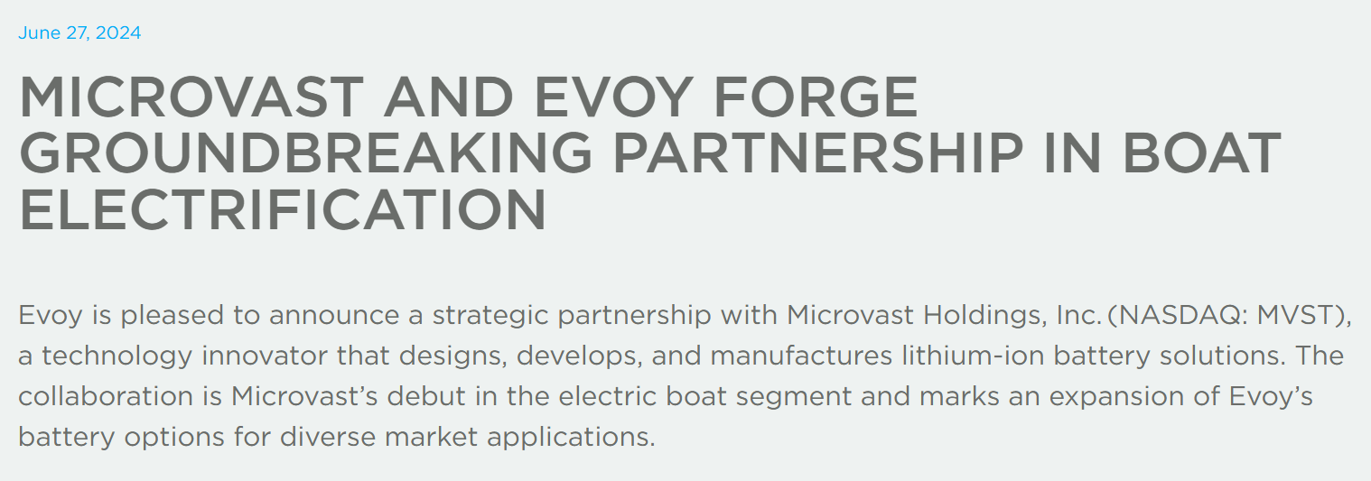 On June 27, 2024, both companies announced that MVST had “forged a groundbreaking partnership” with Evoy, an electric boat manufacturer from Norway. According to the press release, “Evoy will be integrating MVST MV-I high-power battery packs into their leisure boat product line.” Also note that MVST would not be the sole battery supplier for Evoy, as stated at the end of the press release “This partnership complements Evoy’s ongoing relationships with other key battery suppliers”. MVST also highlighted this relationship as a “strategic partnership” in their Q2 2024 Investor Presentation and in their Q4 2023 Investor Presentation as well.