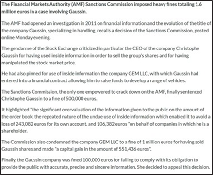 Gaussin was also fined by the Financial Markets Authority (AMF) Sanctions Commission for falsifying its books.