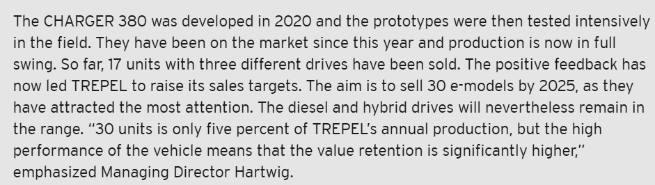 The counterpart is not the issue, as Mafi & Trepel are both legitimate companies with high revenue and recognition. The issue here lies in the economic substance of this relationship, which we uncovered is nothing to be excited about. The main vehicles that MVST’s batteries are supposed to be powering, the Charger 380e Tractor line, saw abysmal sales with only 17 sold since 2020.