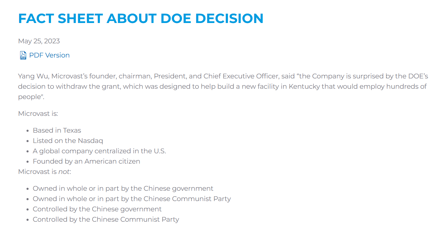 In 2022, as mentioned earlier, the U.S. Department of Energy reportedly awarded $200 million to MVST for the project of “Thermally Stable Polyaramid Separator U.S. Manufacturing Plant.” However, after several months, the Department of Energy “canceled a $200 million grant awarded to Microvast after lawmakers questioned the lithium-ion battery maker’s ties to China’s government,” according to this report and other sources.