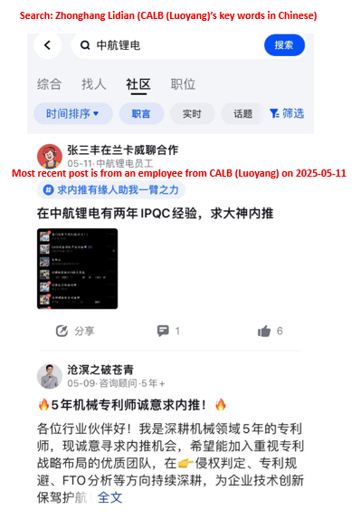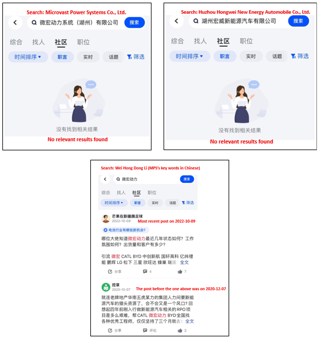 However, when we search the Chinese name of China Aviation Lithium Battery (Luoyang) Co., Ltd. on Maimai, we find posts from its employees from 2023 and 2024, as compared to no results at all when searching MVST’s two major subsidiaries’ Chinese names on Maimai as shown above.