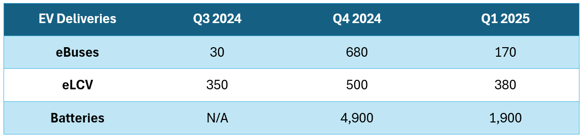 MVST has announced to investors that it forecasts a growth of over 20% in the EMEA (Europe, Middle East, Africa) in their latest Investor Presentation, but we believe that revenue will fall short of these expectations. While Iveco had a strong year in terms of electric vehicle sales, with a huge increase in deliveries especially in the Q4 2024, their sales numbers for Q1 2025 and their forecast for the rest of the year indicate a slowing, declining growth, which means the same for MVST’s revenue from this client.