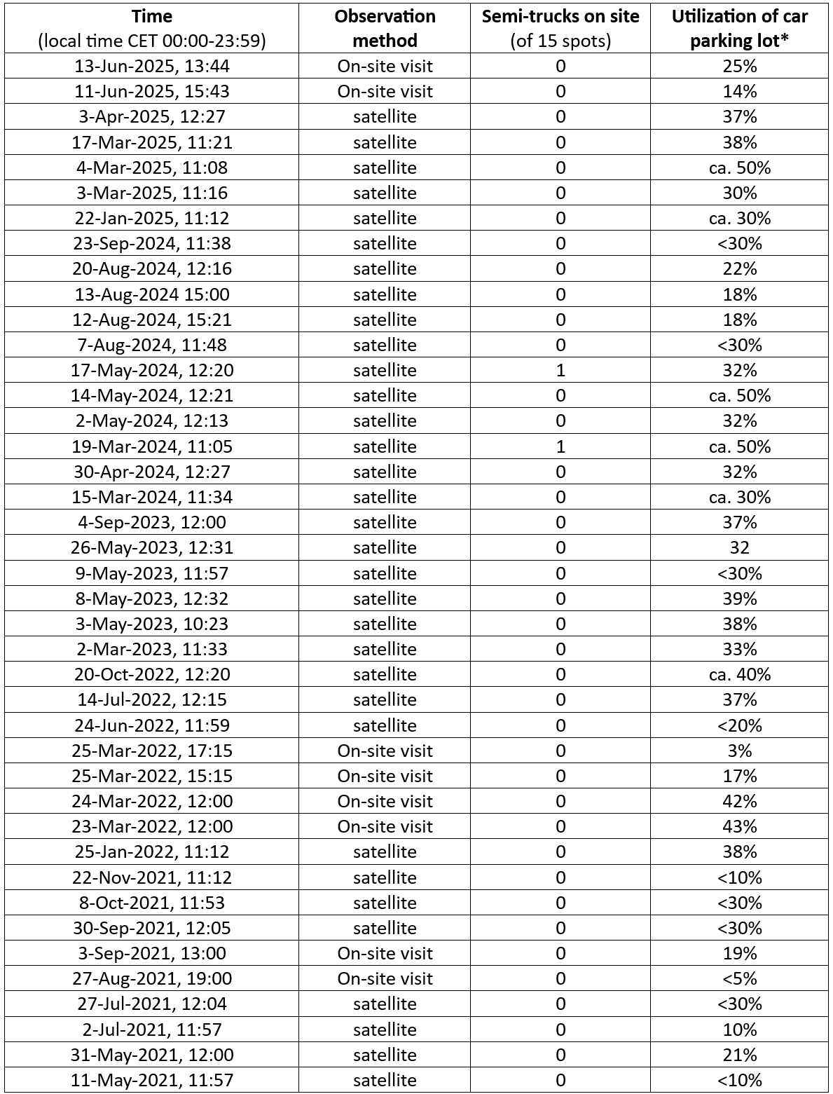 We extensively observed MVST’s Ludwigsfelde/Berlin plant since the start of production in March 2021. Out of 41 random observations during business hours, we saw a semi-truck docked at one of the facility’s fifteen dedicated spots only twice. Thus, all spots were almost always empty.