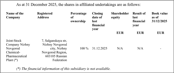 Nidda Lynx’s 2024 annual accounts, filed before the April 2025 decree, stated 100% ownership of JSC Nizhny Novgorod Chemical-Pharmaceutical Plant (JSC Nizhpharm), one of the largest domestic pharmaceutical manufacturers in Russia.