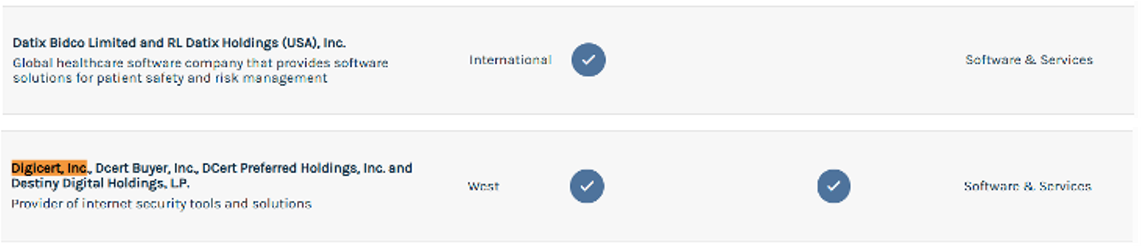 For example, Ares Management categorizes Digicert, Inc, Datix Bidco Limited, and RLDatix Holdings (USA), Inc. in the Software & Services, whereas Partners Group categorizes DigiCert, Inc. as IT Services, and categorizes Datix Bidco Limited and RLDatix Holdings (USA), Inc. in Health Care Technology.