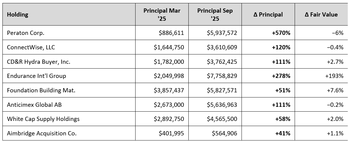 At the September 30, 2025, reporting date, 26 days later, the combined position was marked at $57.6 million, a 7.4% return, driven by a 383.1% markup on the small common-equity slice.