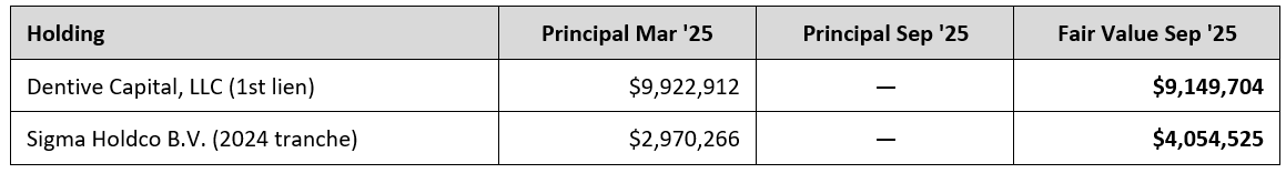 In the Master Fund’s September 30, 2025, direct-debt schedule, we observe principal changes that do not correspond to either payment flows or documented follow-on investments. In the Dentive Capital and Sigma Holdco lines, the reported principal goes to zero while the fair value remains materially positive, a combination that is neither the scheduled-payment case (where FV would also decline) nor the default-and-recovery case (where principal would not be reported as zero).