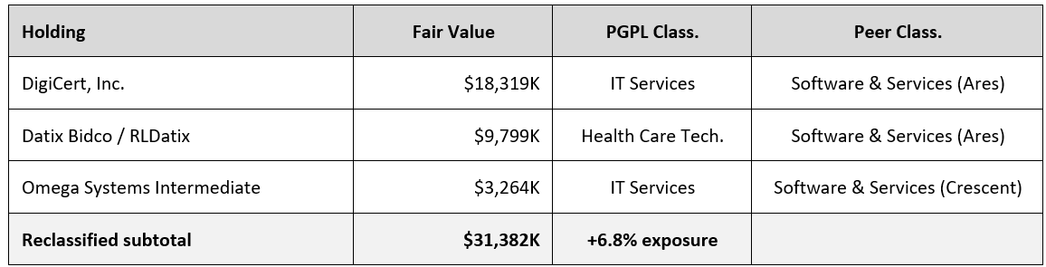 That 25.2% apparently understates actual exposure. Three PGPL holdings that Partners Group classifies outside Software & Services are classified within Software & Services by other BDCs: