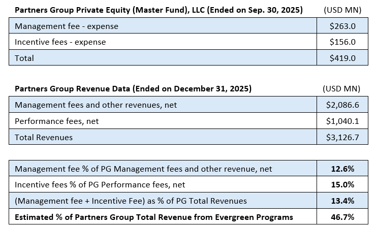 Partners Group’s most prominent evergreen fund is its Partners Group Private Equity (Master Fund), LLC (“Master Fund”), with about $15.9 billion Net Assets Value (“NAV”) of the total $56 billion in the evergreen programs.  The disclosure below shows how meaningful the financial contribution from the Master Fund alone was and implies that Evergreen Programs’ contribution is almost half of Partners Group’s revenue.