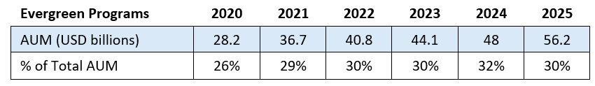 Partners Group is one of Europe’s largest alternative asset managers, with approximately $185 billion in assets under management (“AUM”) as of year-end 2025. The company and its management are often praised for being innovators in the industry. They are credited with pioneering evergreen investment vehicles for private investments as well as bringing access to Private Equity and Private Credit investments to retail investors. An Evergreen fund is exactly what the name implies: It is a permanent investment vehicle as opposed to traditional private equity investment mandates that have a limited time horizon.