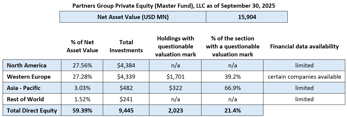 The Master Fund’s Direct Equity portfolio ($9.45 billion) represents 59.39% of the Fund’s NAV as of September 31, 2025. Within that, $4.34 billion is in Western Europe. There are also holdings that were categorized into regions such as Asia–Pacific and the Rest of World.
