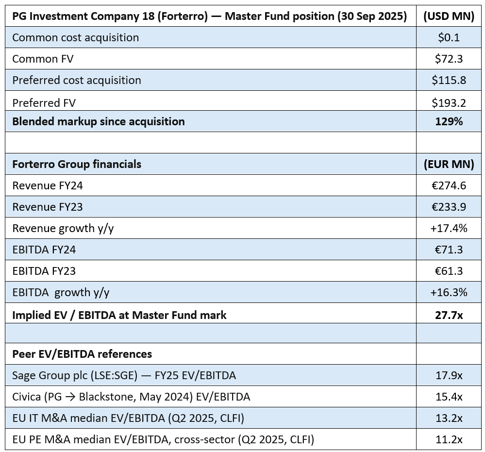 In 2023, it was reported that Partners Group sold a software company called Civica to Blackstone for about £2 billion, and that company produced EBITDA of £130 million. That transaction was completed in the second half of 2024. This deal valued Civica at EV/EBITDA of about 15.4, according to the report. If investors were to apply 15.4 EV/EBITDA to Forterro, Master Fund’s implied preferred and common equity values in PG 18 would be 58.1% lower than its mark as of September 30, 2025.