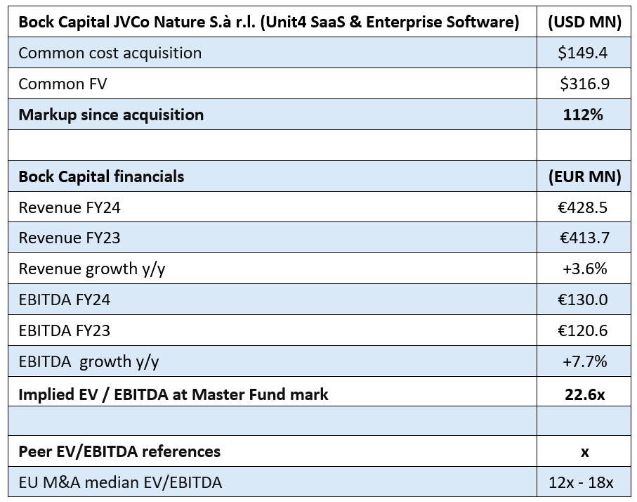 As of September 30, 2025, the Master Fund held 12.59 billion shares of the Luxembourg company named Bock Capital JVCo Nature S.à r.l. (“Bock Capital JVCo I” thereafter) as a common equity position, which accounts for about 12.9% of its total outstanding shares. Bock Capital JVCo I essentially holds an enterprise software company called Unit4 Group, which is based in the Netherlands. Master Fund’s investment in Bock Capital JVCo I appreciated 112.1% since July 2021, with its initial cost of $149.4 million increasing to its fair value of $316.9 million.