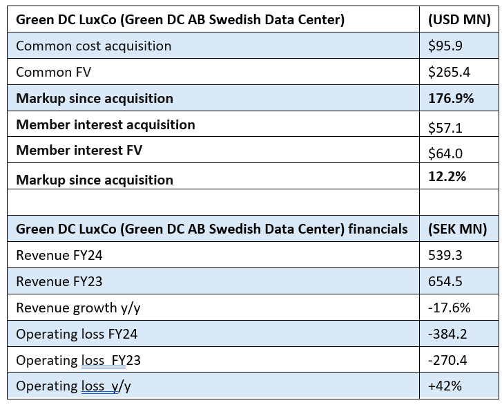 The Master Fund’s Green DC LuxCo common equity position is marked up 176.9% since January 2022, with a cost of $95.9M to the fair value of $265.4M as of September 30, 2025. The combined common equity and member interest marked up 115.5% during this period.