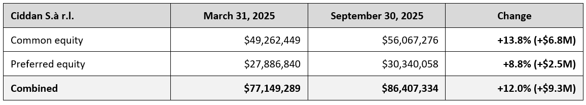 Over the same reporting window, which is the six months from March 31, 2025, through September 30, 2025, Partners Group marked its combined position of both preferred and common equity in Ciddan up 12.0%, from $77.1 million to $86.4 million. The mark-up happened during the period when the seizure occurred, not before it or after it.