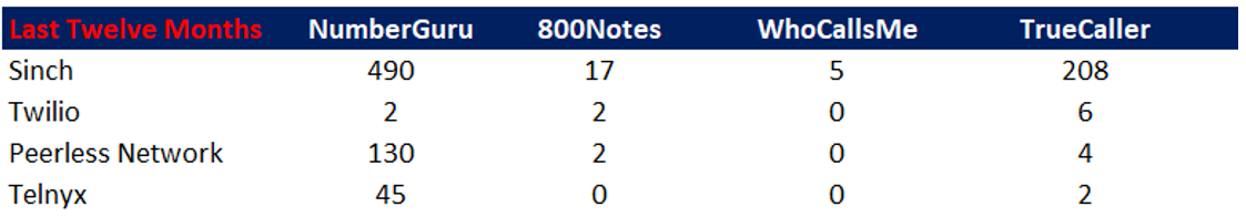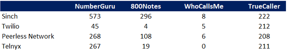 Further, an analysis done on phone number lookup websites shows us that Sinch and its subsidiaries are constantly flagged and looked up by individuals at a higher rate than their peers.