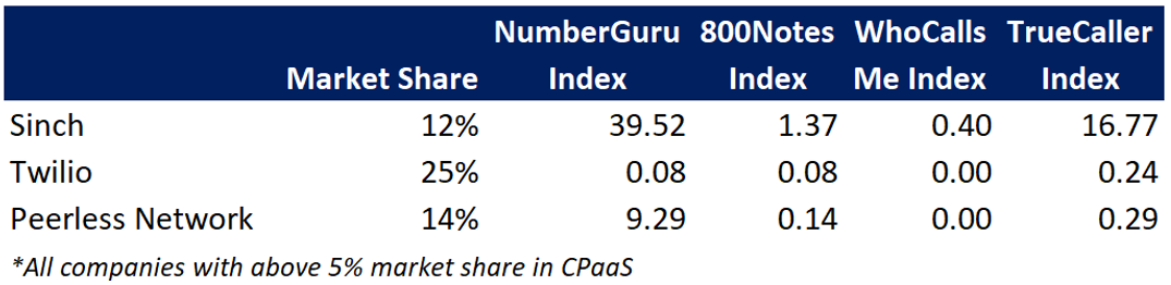 We developed an index that weights these results based on each company’s estimated market share above 5%, according to Metrigy. This allows for a more “apples-to-apples” comparison of the relative exposure of each CPaaS provider to spam call activity. This once again showcases that Sinch ranks significantly higher than its peers. We believe this is a fair and appropriate comparison, as all the companies operate within the CPaaS sector.