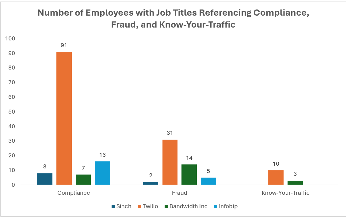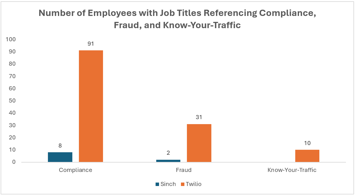 Twilio has a significantly larger total number of employees with job titles relating to fraud, KYC or compliance with 149 people. Twilio has multiple, large-scale teams for each of these divisions. Twilio had over 91 employees with job titles referencing compliance and nearly a 55-person dedicated compliance team.