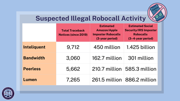 “A similar analysis of Inteliquent’s likely involvement in the routing of nationwide call traffic concerning SSA/IRS government imposter robocalls was assessed. Between May 2020 and November 2024, among a nationwide sample of approximately 6.2 million transcribed and recorded SSA/IRS government imposter robocalls, more than 2.85 million of these SSA/IRS government imposter robocalls were estimated to be facilitated by Inteliquent. Thus, of the over 3.1 billion estimated SSA/IRS government imposter robocalls reaching consumers across the country in this sample during this period, approximately 1.425 billion of these scam robocalls were estimated to be facilitated by Inteliquent.” – December 2025, AG Letter