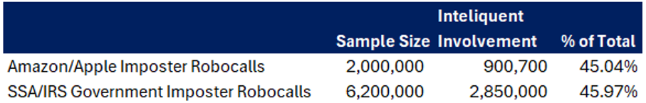 According to the notice, Inteliquent is responsible for roughly 45% of the total amount of Amazon, Apple, and government imposter robocalls measured by the task force. We find this to be a ridiculously high number.