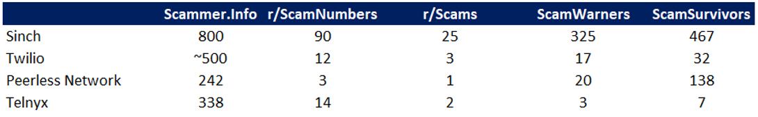 - We believe Sinch’s compliance team is inadequate both in scale and effectiveness given the volume of scam and robocalls its platform can enable, especially relative to peer operators. This aligns with the feedback we have gotten from consumers and industry experts who complain about Sinch’s enforcement against fraudsters.